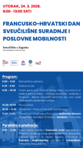 Pozivamo vas na Francusko-hrvatski dan sveučilišne suradnje i poslovne mobilnosti koji Sveučilište u Zagrebu, u suradnji s Veleposlanstvom Francuske Republike u Republici Hrvatskoj, organizira u utorak, 24. ožujka 2026. od 9 do 13 sati na Rektoratu Sveučilišta u Zagrebu, Ulica Radoslava Cimermana 88.