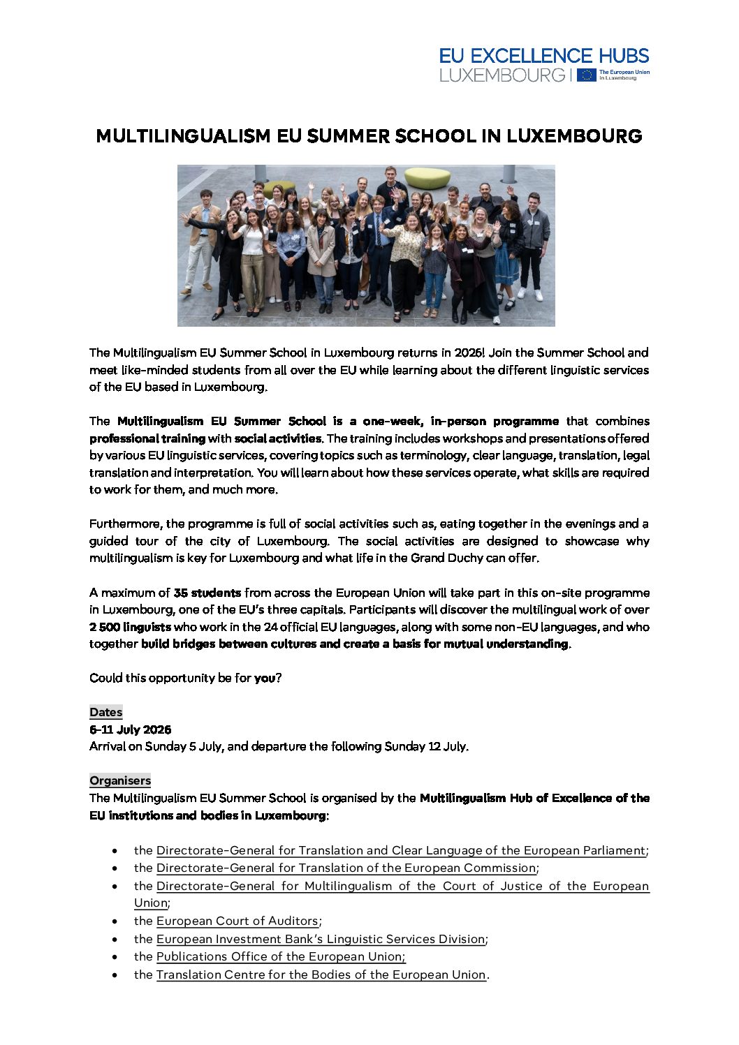 U Luksemburgu se od 6. do 11. srpnja 2026. održava ljetna škola višejezičnosti. Iako je primarno namijenjena studentima iz mreže Europskih diplomskih studija pismenog prevođenja (European Master’s in Translation (EMT)), ove godine prijave su otvorene i za hrvatske studente prevoditeljskih smjerova. Rok za prijave je 17. travnja, a sve upute nalaze se u dokumentima u prilogu.