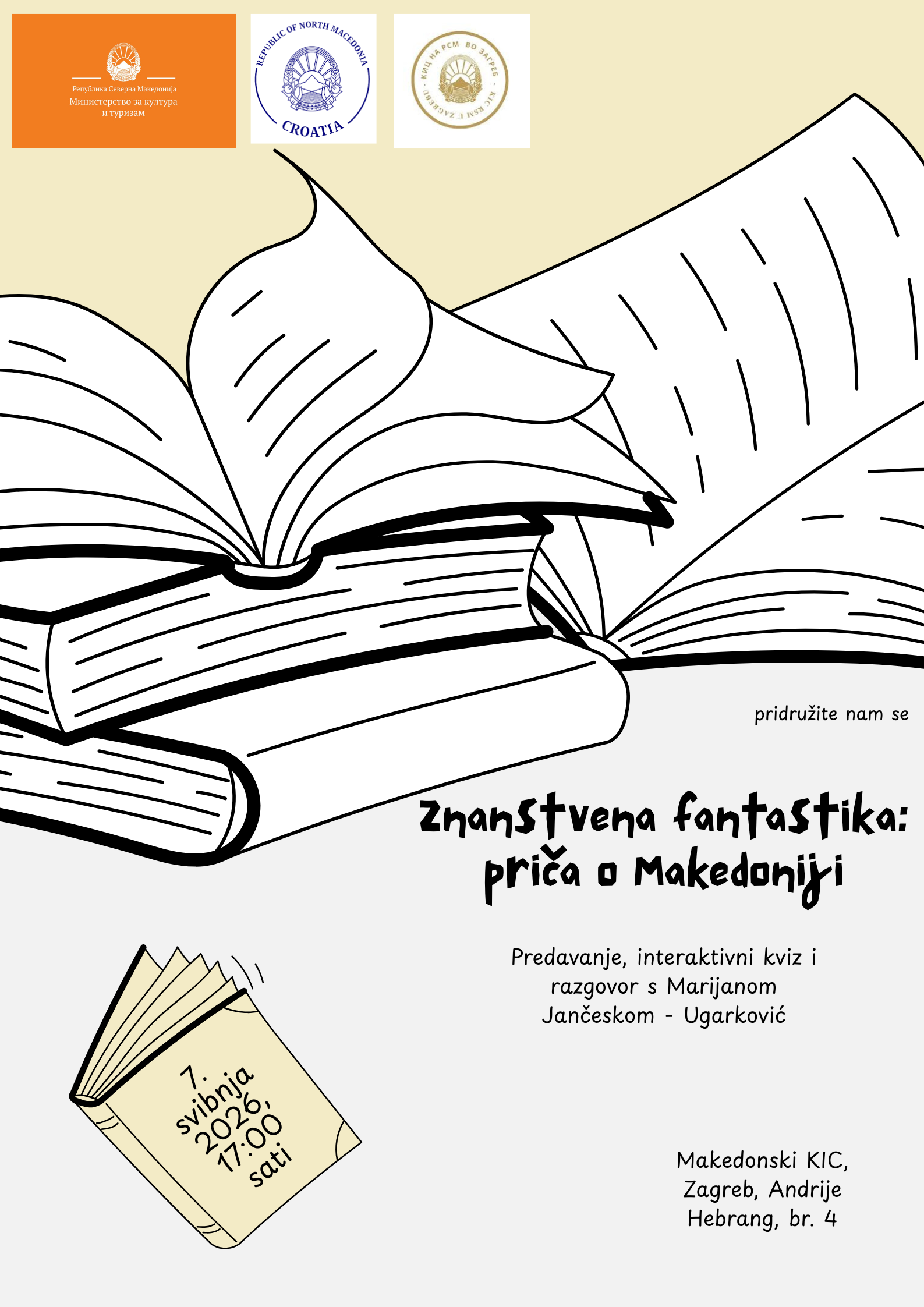 Makedonski KIC u Zagrebu poziva na događaj „Znanstvena fantastika: priča o Makedoniji“ (7.5. u 17h, Hebrangova 4), koji kroz predavanje, interaktivni kviz i razgovor otvara zanimljiv pogled na makedonsku književnost i kulturu iz perspektive znanstvene fantastike. Program će voditi Marijana Jančeska Ugarković, a osmišljen je tako da bude pristupačan i poticajan za različite uzraste.