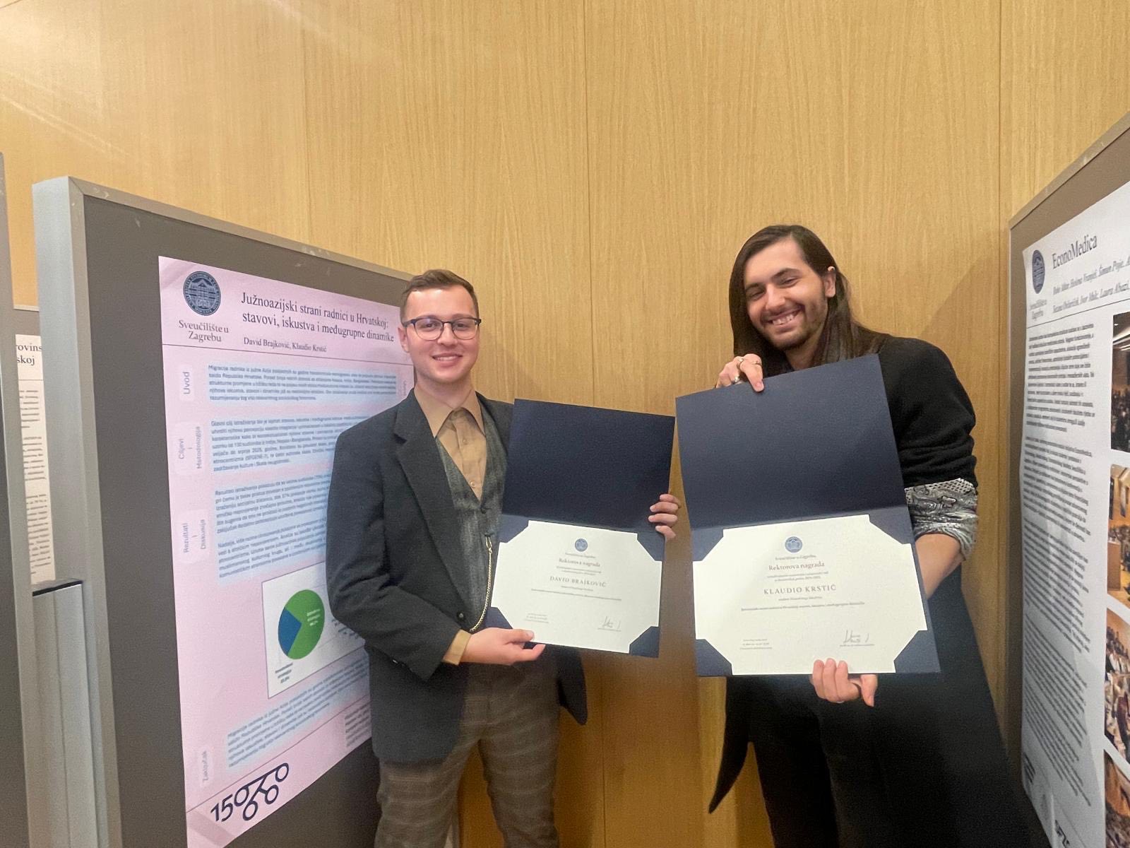 Student prijediplomskog studija sociologije i anglistike David Brajković te njegov kolega, student anglistike i indologije Klaudio Krstić, dobitnici su ovogodišnje Rektorove nagrade za individualni znanstveni i umjetnički rad (jedan ili dva autora) u području društvenih znanosti, za akademsku godinu 2024./2025.
